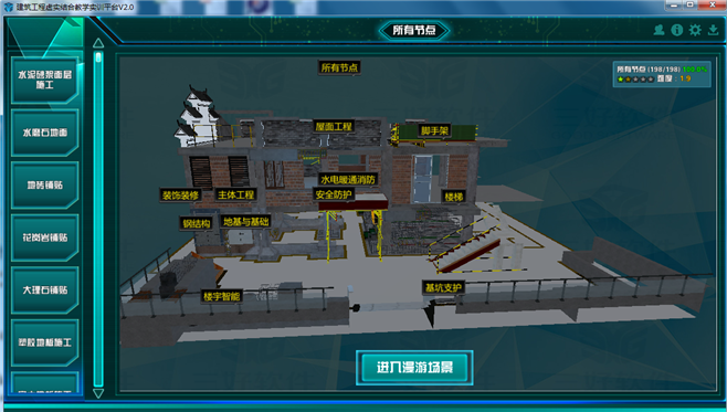 2. 建筑工程虛擬仿真教學軟件系統(tǒng)可通過漫游模式或點擊對應菜單進入仿真程序,并在進入程序后可進行相互切換。