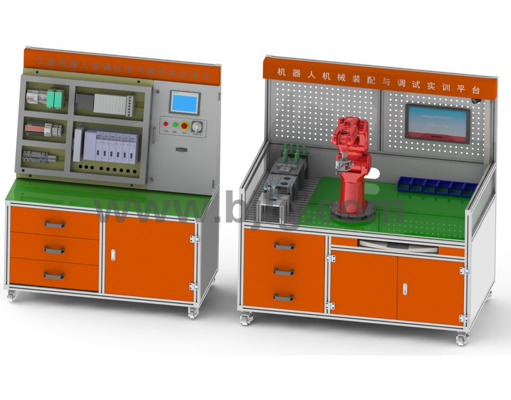 LGH-IRW03型 工業(yè)機器人裝調(diào)應用與維護實訓平臺設置內(nèi)容對應工業(yè)機器人機械裝配與調(diào)試、電氣安裝與調(diào)試、機電聯(lián)調(diào)、機器人功能應用、PLC 應用、故障維修等職業(yè)技術技能,涵蓋工業(yè)機器人機電裝調(diào)、工業(yè)機器人位置示教、工業(yè)機器人編程、工業(yè)機器人與 PLC 的通信、人機交互、可編程控制、氣動控制等專業(yè)核心能力和核心知識。同時,工業(yè)機器人裝調(diào)應用與維護實訓平臺可服務于中職、高職以及應用本科院?!豆I(yè)機器人基礎》、《工業(yè)機器人拆裝與調(diào)試》、《工業(yè)機器人示教與編程》、《工業(yè)機器人應用與維護》等多門課程教學,引領相關院校機器人及相關專業(yè)的課程建設和深化課程教學改革。LGH-IRW03型 工業(yè)機器人裝調(diào)應用與維護實訓平臺由“機器人機械裝配與調(diào)試實訓平臺”和“機器人電氣安裝與調(diào)試實訓平臺”兩大部分構(gòu)成,并配置軌跡描繪、搬運、碼垛等典型應用實訓組件。