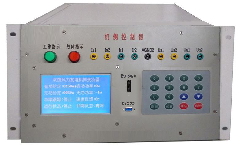 機側(cè)控制器的作用主要有兩個方面,一是給雙饋發(fā)電機的轉(zhuǎn)子提供勵磁分量的電流,從而可以調(diào)節(jié)雙饋發(fā)電機的定子側(cè)所發(fā)出的無功功率;二是通過控制雙饋發(fā)電機轉(zhuǎn)子轉(zhuǎn)矩分量的電流控制發(fā)電機的轉(zhuǎn)速或控制發(fā)電機定子側(cè)所發(fā)出的有功功率,從而使發(fā)電機運行在風(fēng)力機的*佳功率曲線上,實現(xiàn)*大風(fēng)能追蹤(捕獲)運行。機側(cè)控制器面板安裝有兩個信號指示燈,16鍵PVC軟鍵盤,240*128點蘭色液晶屏及9個波形測試端子。信號指示燈可對控制器工作、保護狀態(tài)分別指示;鍵盤可完成機側(cè)控制器啟動/停止設(shè)置,*大功率啟動/停止跟蹤設(shè)置,有功/無功給定,手動并網(wǎng)/離網(wǎng);液晶屏可顯示轉(zhuǎn)速反饋值,有功/無功反饋值;波形測試端子可通過示波器觀測發(fā)電機機轉(zhuǎn)子、定子相電流波形,可觀測發(fā)電機定子相電壓、電網(wǎng)相電壓波形。