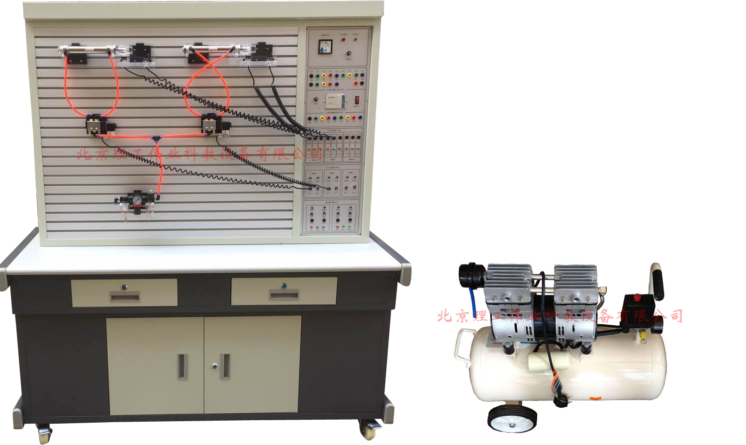 4、透明氣動與PLC實(shí)訓(xùn)裝置采用無油靜音空壓機(jī),為實(shí)訓(xùn)室提供一個(gè)較好的實(shí)訓(xùn)環(huán)境。
