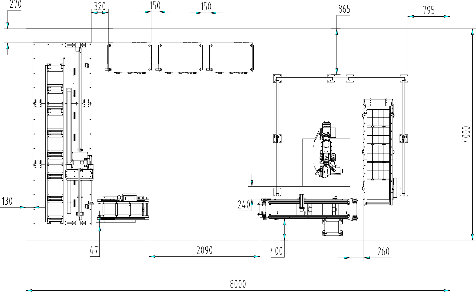 本設(shè)備共包括:工業(yè)機器人及控制柜、PLC 控制柜、托盤流水線、物品盒擺放流水線、AGV 小車等。比賽所用場地為 4m×8m,如圖 2-1 所示為裝備之間的大致布局,現(xiàn)場安裝時并不一定嚴(yán)格按照圖中所標(biāo)尺寸安裝,允許有所變動。在安裝時需要注意以下事項: