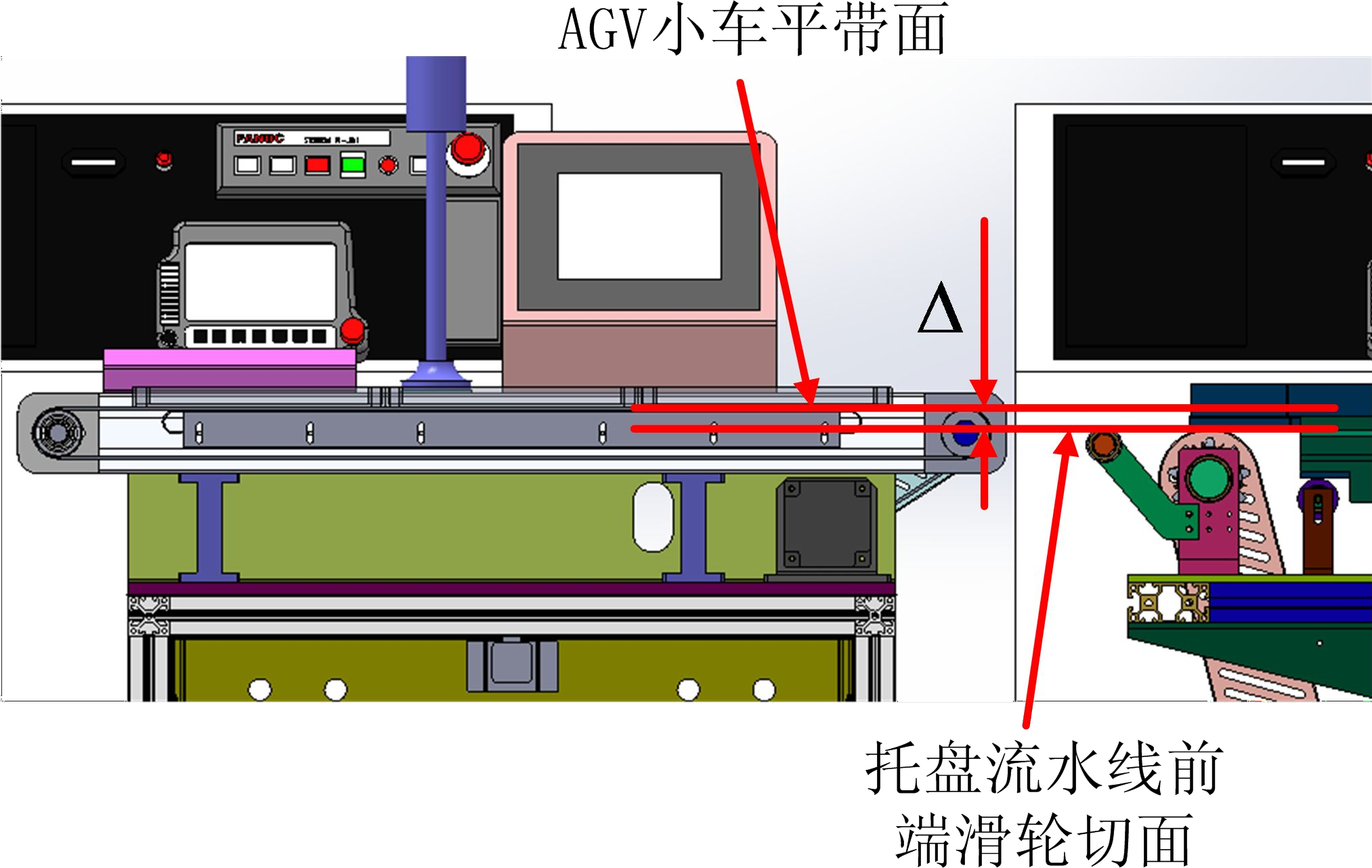 (4) 確保托盤流水線前端滑輪的平切面低于AGV 小車的平帶面;(見圖 2-2)。