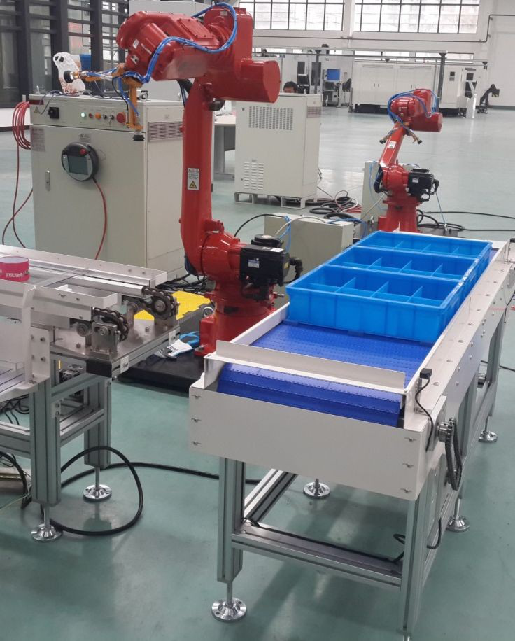 (3) 托盤流水線,負責(zé)把貨品托盤輸送到視覺檢測工位,經(jīng)視覺定位識別輸送到抓取工位;