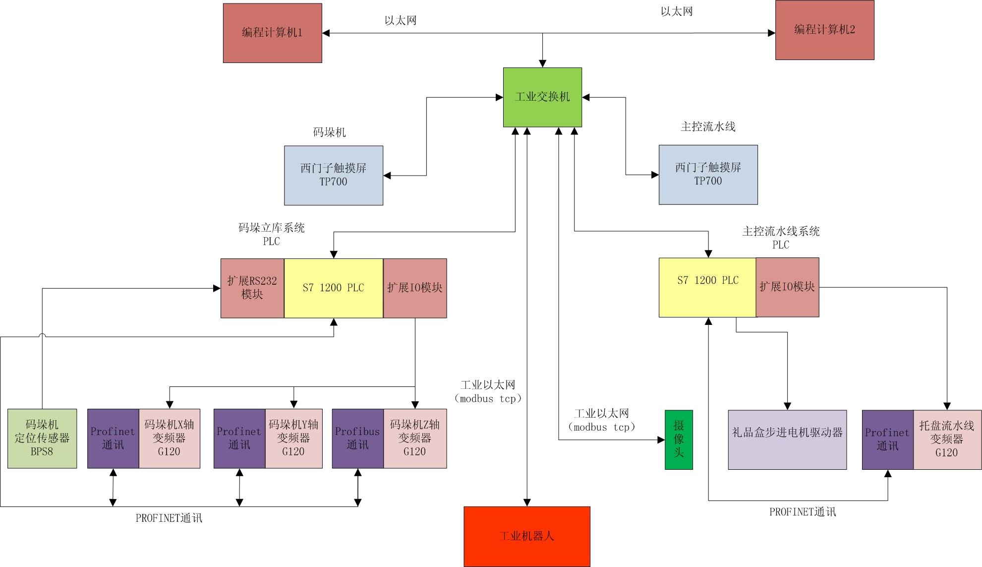 如上圖所示,整個系統(tǒng)通過工業(yè)以太網(wǎng)總線,把工業(yè)機器人、主控流水線 PLC、碼垛機立庫系統(tǒng) PLC、碼垛機立庫系統(tǒng)觸摸屏、主控流水線觸摸屏、視覺系統(tǒng)、變頻器以及編程開發(fā)計算機等均通過以太網(wǎng)連接。編程開發(fā)計算機負責(zé)開發(fā)調(diào)試程序、視覺系統(tǒng)特征識別開發(fā)以及機器人示教等編程。碼垛立庫系統(tǒng)和主控流水線觸摸屏負責(zé)管理碼垛立庫系統(tǒng)、主控流水線的運行參數(shù),以及系統(tǒng)報警和提示信息等。