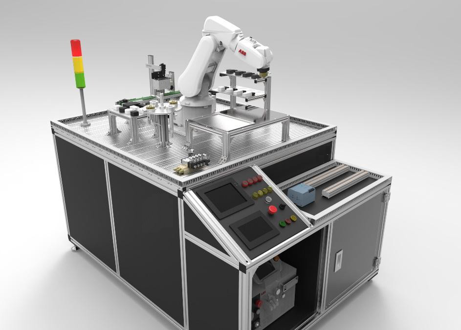 另外,模塊化機(jī)械設(shè)計(jì)是工業(yè)發(fā)達(dá)國(guó)家近二十年來(lái)一直采用的一種先進(jìn)的機(jī)械產(chǎn)品設(shè)計(jì)方法。學(xué)生自主設(shè)計(jì)臺(tái)面功能模塊可作為《機(jī)械設(shè)計(jì)》課程的綜合實(shí)驗(yàn)部分。學(xué)生根據(jù)課上所學(xué)機(jī)械原理和機(jī)械設(shè)計(jì)的基礎(chǔ)知識(shí),在三維設(shè)計(jì)軟件中實(shí)現(xiàn)自己的設(shè)計(jì)想法,可自行設(shè)計(jì)機(jī)器人末端工具,臺(tái)面工裝、生產(chǎn)流水線及視覺(jué)分揀等。學(xué)生也可組隊(duì)完成整個(gè)臺(tái)面的重新規(guī)劃,利用設(shè)備本體提供的氣路和電路總線,賦予臺(tái)面新的設(shè)計(jì)亮點(diǎn)。此部分也可作為機(jī)械設(shè)計(jì)、機(jī)械制造、機(jī)電一體化、工業(yè)設(shè)計(jì)等專業(yè)的畢業(yè)設(shè)計(jì)內(nèi)容。此工作站整體外形統(tǒng)一,具有外部通訊接口,所以有配置靈活、便于擴(kuò)展的優(yōu)點(diǎn)。各工作站既可以作為獨(dú)立的功能個(gè)體,完成機(jī)器人的實(shí)訓(xùn)任務(wù)。也可以作為相互的擴(kuò)展模塊,通過(guò)電纜緊密拼裝后組成一個(gè)整體的結(jié)構(gòu)。某一個(gè)工作站作為主控,其他工作站協(xié)同。通過(guò)之前所述不同的設(shè)計(jì)賦予每個(gè)工作站不同的功能, 可添加節(jié)拍控制、生產(chǎn)管理、工業(yè)系統(tǒng)工程等管理思路,使其整體實(shí)現(xiàn)更加多元化的功能。