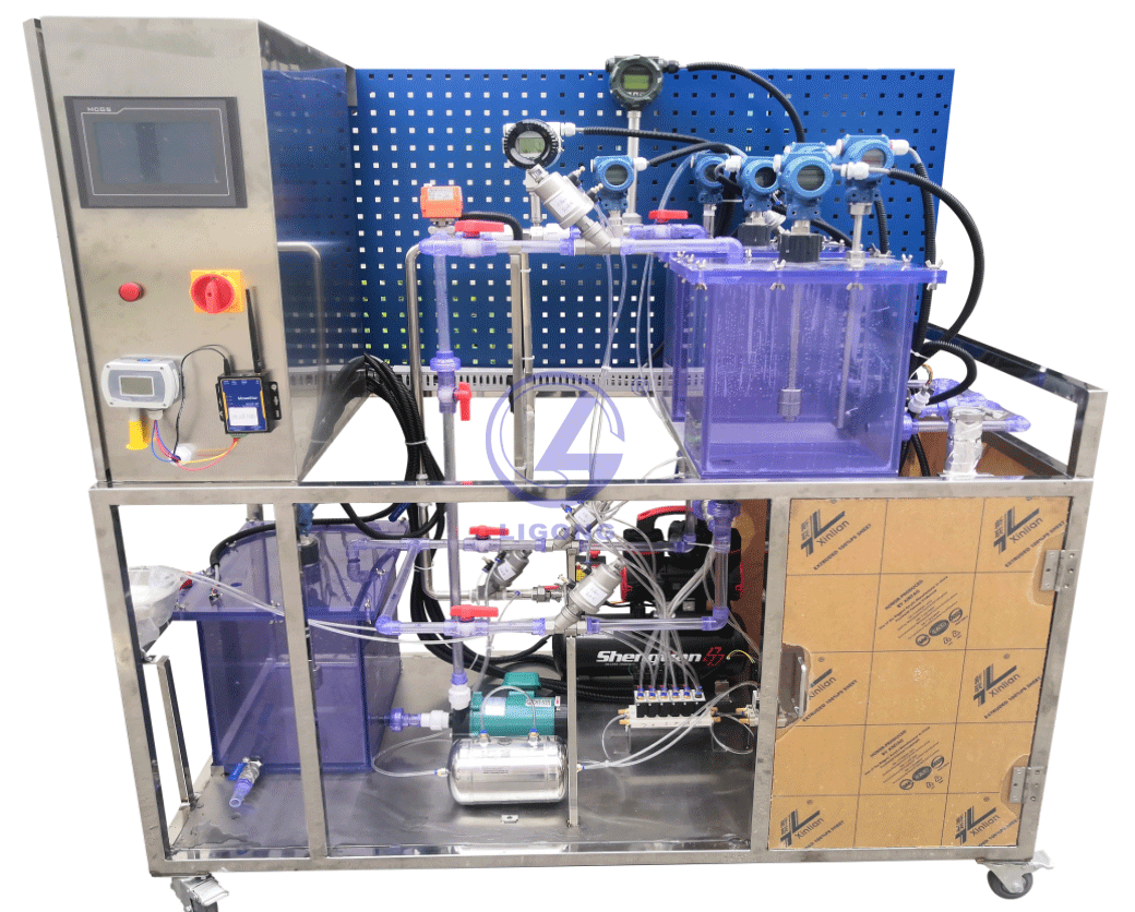 實(shí)訓(xùn)臺(tái)以水、氣/汽、電能耗監(jiān)測(cè)為背景,采用液位計(jì)、流量計(jì)、溫度變送器、壓力變送器、電磁閥、水泵、氣泵、電氣控制箱、水箱等裝置模擬工業(yè)場(chǎng)景下的水循環(huán)、氣循環(huán)、電能監(jiān)測(cè)常見的過程控制系統(tǒng)。其中水箱作為液體盛放和氣體導(dǎo)入的氣液混合容器,模擬化工行業(yè)常見的化工產(chǎn)品制備工藝場(chǎng)景。通過現(xiàn)場(chǎng)監(jiān)控裝置及傳輸模塊,將液位、流量、壓力、水溫、氣溫、電壓、電流、電量等過程控制參數(shù)進(jìn)行數(shù)據(jù)采集,傳輸?shù)侥茉垂芾砥脚_(tái),達(dá)到工業(yè)水、汽、氣、電等至少三種數(shù)據(jù)采集控制、數(shù)據(jù)傳輸、數(shù)據(jù)存儲(chǔ)、數(shù)據(jù)分析及可視化展示的目的。
