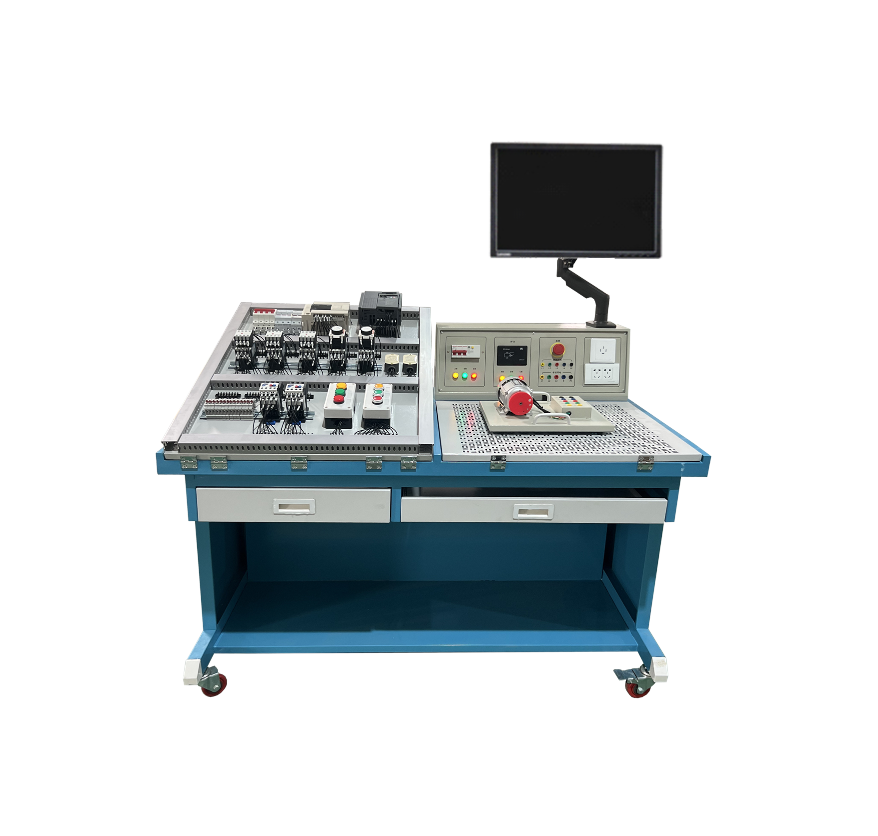 LG-WDG02A型 通用電工競(jìng)賽訓(xùn)練平臺(tái)由實(shí)訓(xùn)屏(內(nèi)置電源)、實(shí)訓(xùn)桌(含鍵盤(pán))、儲(chǔ)物柜三大部分組成。鋼制表面經(jīng)高溫噴塑處理,美觀(guān)大方且有效起到防銹絕緣的作用;電源箱的布局依次為電源保護(hù)裝置、電源指示裝置、電源輸出;實(shí)訓(xùn)桌左側(cè)安裝有角度可以調(diào)節(jié)的嵌入式的考核平臺(tái)1張,所有元器件均采用端子引出,學(xué)生接線(xiàn)只需在端子上進(jìn)行接線(xiàn),可以有效的保護(hù)元器件,轉(zhuǎn)接端子采用接插兩用端子排,方便與元器件和實(shí)訓(xùn)電源屏的連接,右側(cè)裝有網(wǎng)孔板一塊,角度可調(diào)嵌入式安裝;實(shí)驗(yàn)桌底部裝有至少4個(gè)導(dǎo)向輪,方便設(shè)備移動(dòng);儲(chǔ)物柜采用標(biāo)準(zhǔn)結(jié)構(gòu)和抽屜式,用于存放工具以及實(shí)訓(xùn)資料。電腦通過(guò)可調(diào)節(jié)電腦支架安裝于電源屏的上方。