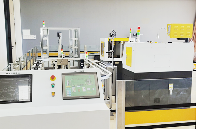 LGY-CX06型 智能制造生產(chǎn)線實訓系統(tǒng)是對工業(yè)現(xiàn)場大型設備進行提煉和濃縮的一款小型智能制造生產(chǎn)線實訓設備,專門為職業(yè)院校、教育培訓機構等而研制的,它適合機械制造及其自動化、機電一體化、電氣工程及自動化、控制工程、測控技術、計算機控制、自動化控制等相關專業(yè)的教學和培訓。融合了數(shù)控機床加工、光、電、氣,包含了PLC、機器人、傳感器、氣動、工業(yè)控制網(wǎng)絡、電機驅動與控制、計算機等諸多技術領域,對柔性制 造技術的工作過程進行研究,監(jiān)控系統(tǒng)、主控PLC和下位PLC通過網(wǎng)絡通訊技術構成一個完整的多級計算機控制系統(tǒng),通過訓練,使學生了解智能制造生產(chǎn)線的基本組成和基本原理,讓學生全面掌握機電一體化技術的應用開發(fā)和集成技術,幫助學生從系統(tǒng)整體角度去認識。為信息學院自動化和電氣工程自動化本科及其控制科學與工程研究生均提供了實驗和科研的平臺。
