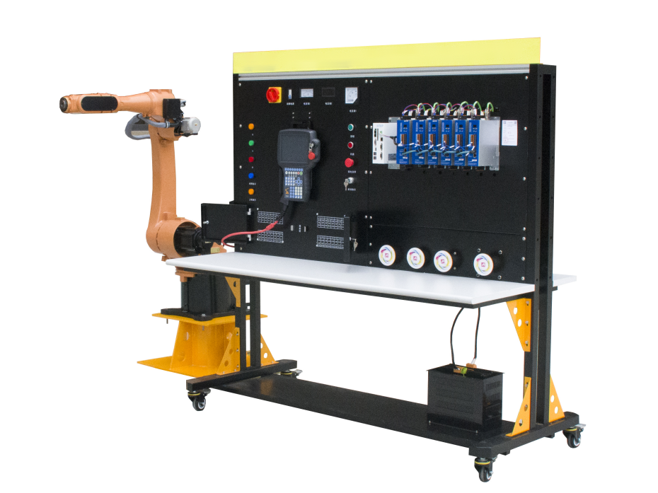 本公司開發(fā)的工業(yè)機(jī)器人電氣控制與故障診斷實(shí)訓(xùn)考核設(shè)備是按照工業(yè)上真實(shí)工業(yè)機(jī)器人電氣控制系統(tǒng)標(biāo)配設(shè)計(jì)而成。其主要配置為:一臺STEP工業(yè)機(jī)器人控制器、六臺伺服驅(qū)動(dòng)器、四種型號的伺服電機(jī)、安全邏輯控制單元、I/O信號板、故障設(shè)置模塊、電氣控制實(shí)訓(xùn)臺、示教器、STEP工業(yè)機(jī)器人教學(xué)資料包等。