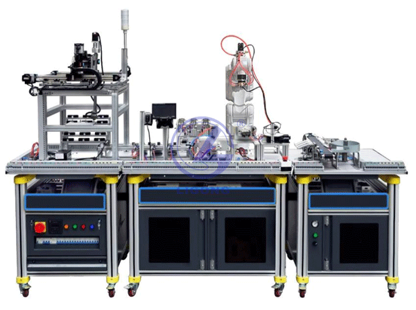 LGY-JD05B型 通用機電設備安裝與調試實訓裝備主要由實訓臺架、典型的機電設備的機械部件, 電氣控制單元等組成。典型的機電設備的機械部件主要包括供料機構、傳送帶輸送分揀機構、工業(yè)機器人、直角坐標機械手、立體倉庫以及可擴展的模擬生產設備實訓模塊等; 電氣控制單元主要有電源配電、PLC 可編程控制器、觸摸屏、變頻器、步進電機控制、伺服電機控制、按鈕指示燈、接線端子及各種檢測傳感器等部分組成。整體結構采用開放式和拆裝式,可根據現有的機械部件,以模塊化的方式組裝和搭建具有生產功能的智能生產線設備,也可添加其它機械部件組裝其他生產設備,使整個裝置能夠靈活的按教學實訓要求組裝具有模擬生產功能的智能生產線設備。