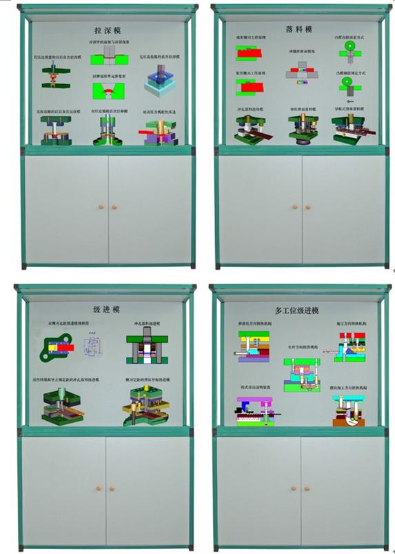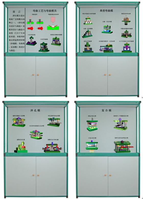 CLG-N04型 多媒體智能控制《沖壓模具設(shè)計與制造》陳列柜是模具設(shè)計與制造專業(yè)的一門主干專業(yè)技術(shù)課。適用于《沖壓模具設(shè)計與制造》、《沖模設(shè)計應(yīng)用實例》等課程。本課程是以教育部高教司《關(guān)于加強高職高專人才培養(yǎng)工作的若干意見》等文件對高職高專人才培養(yǎng)的要求為指導(dǎo)思想。采用多種素材和媒體手段,講述典型沖模(沖裁模、彎曲模、拉深模)的設(shè)計與制造,適度介紹了多工位級進模設(shè)計與制造。陳列柜共分八個柜和一個電腦控制臺,進行多媒體聲控同步解說演示。柜內(nèi)47件模型均采用動畫圖像由PC電腦軟件控制順序或任選播放演示沖壓模具功能原理。