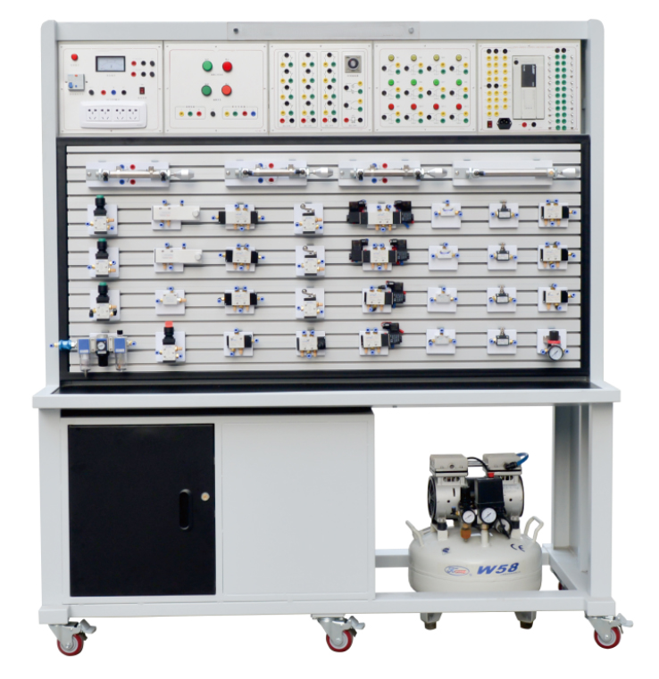 本實訓(xùn)裝備,由氣動元件部分、電氣控制部分及實訓(xùn)臺架等組成,電氣部分主要由PLC模塊、繼電器模塊、電源模塊、按鈕模塊等部分組成。實訓(xùn)臺主體框架采用鋁木結(jié)構(gòu)組裝完成,臺架重量較輕且安裝了萬向輪,可方便實訓(xùn)臺的移動。臺架分上下兩層結(jié)構(gòu),上面可放置電氣模塊,下面是實訓(xùn)屏,實訓(xùn)屏采用帶槽鋁合金結(jié)構(gòu),方便各氣動元件的安裝和拆卸,學(xué)生可以根據(jù)實驗需要在實訓(xùn)屏上任意搭建氣動回路,組成具有一定功能的氣動系統(tǒng)。實訓(xùn)臺采用模塊式結(jié)構(gòu),便于組合與擴展,提高了設(shè)備空間的利用率。