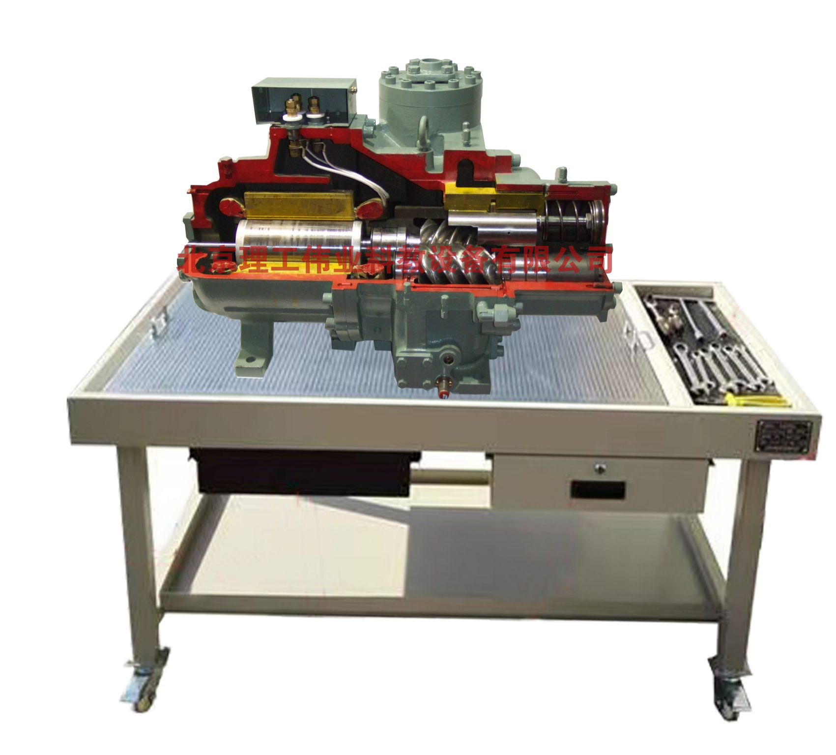 7、小型螺桿式制冷壓縮機(jī)實(shí)訓(xùn)裝置包含一臺(tái)1:1實(shí)物模型的半封閉螺桿壓縮機(jī),此模型沿軸線做四分之一剖開,剖開面做防銹處理。
