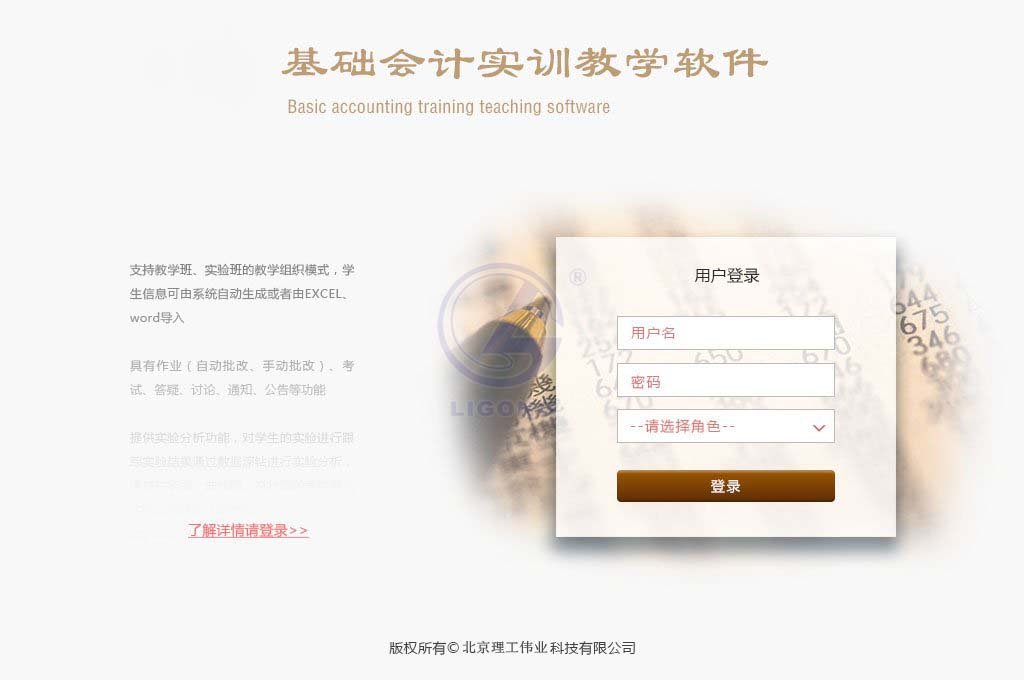 2.教師端模塊:班級管理、實驗管理、開設(shè)實驗、成績統(tǒng)計、實驗分析、課程管理、任務(wù)管理、習(xí)題管理、虛擬企業(yè)、會計制度文件、單據(jù)樣式查詢、實訓(xùn)難度控制、網(wǎng)站薈萃、通知公告、密碼修改。