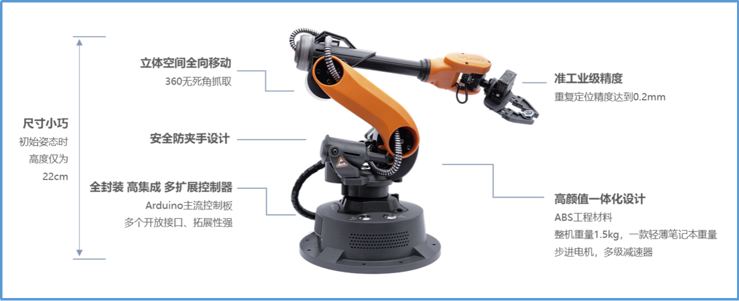 1、六軸桌面機(jī)械臂(含電源、USB接線、IDC通訊線、機(jī)械夾爪、筆夾、多功能控制器、使用說(shuō)明書(shū))×1