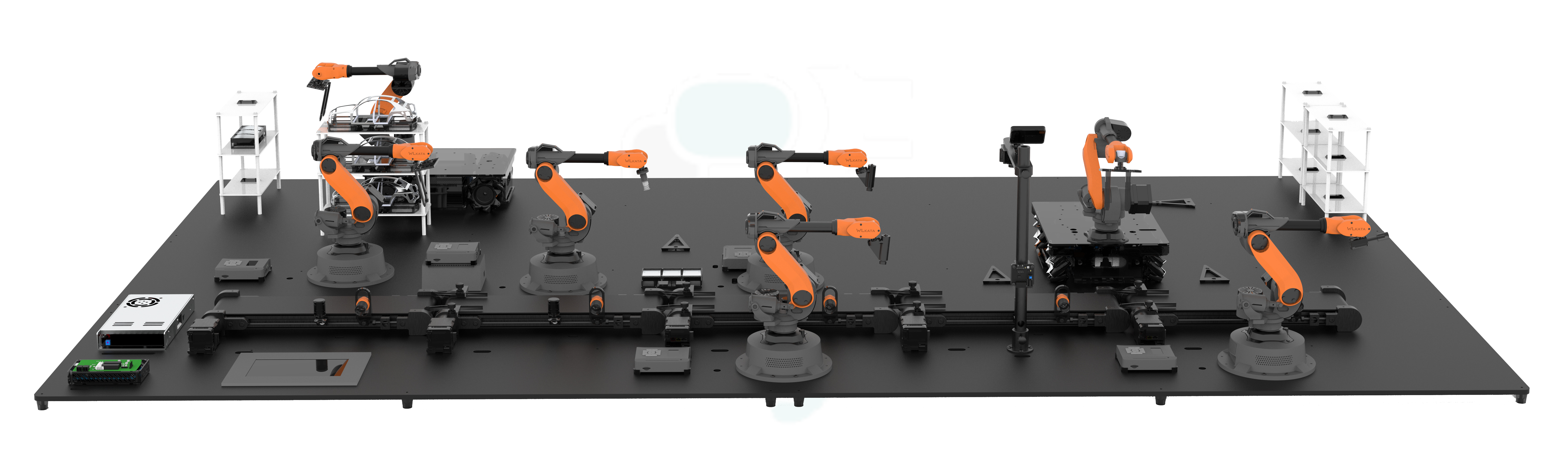 桌面六軸機(jī)器人*5;復(fù)合移動機(jī)器人*2;AI視覺套件*1;傳送單元*5;人機(jī)交互屏*1;配件包*1