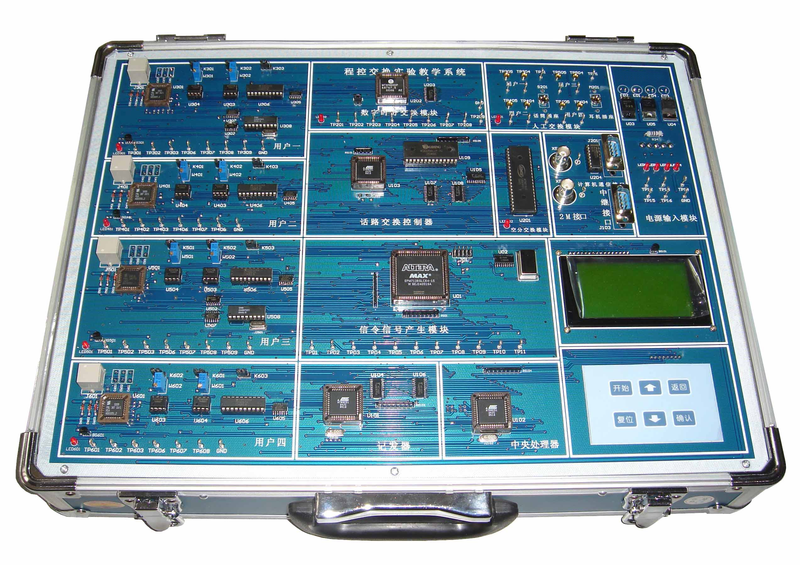 8、CPU中央處理器及控制檢測(cè)電路,主要由CPLD可編程器件EPM7128、鎖存器74HC573等組成,在實(shí)驗(yàn)箱軟件的作用下,完成對(duì)話(huà)機(jī)狀態(tài)的監(jiān)視、信號(hào)音及鈴流輸出的控制、電話(huà)號(hào)碼的識(shí)別、交換命令發(fā)送。